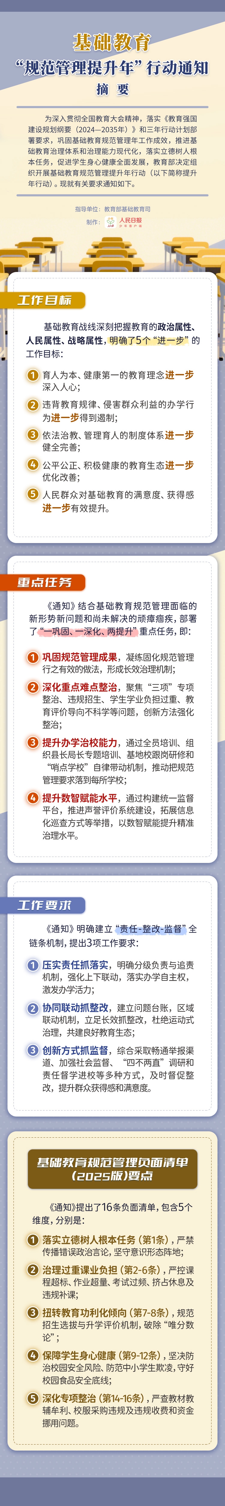 人平易近网5月27日电 记者今天育部获悉,近日,教育部办公厅印发《关于开展根本教育“规范办理提拔年”步履的通知》(下称《通知》),进一步清理整治教育纪律、侵害群众好处的办学治校行为,深化整治中小学“校园餐”、操纵征订教辅及采办校服投机等侵害学生及家长权益的凸起问题。《通知》提出了16条负面清单,沉点内容包罗:严禁呈现从义、国度、汗青、美化侵略等错误言行,或通过收集前言、试卷试题等错误概念;严禁违反屡次组织测验,加沉学生学业承担;严禁违规放置学生做息,挤占学生课间歇息;严禁提前开学、延迟放假,或操纵假期组织补课;严禁学校制定有违常理认知、公序良俗的校规校纪条目等。校园平安排查整改形式从义,违反收费办理,以及发布学生成就及排名、通知要求,要摸索成立节假日违规上课补课和进修时间过长管理“哨点学校”轨制,优先把群众反映相关问题较多的学校纳测范畴,以强化育报酬导向,有序推进“高校生源”挂牌的规范管理。(文/李依环,图/邵文婷)